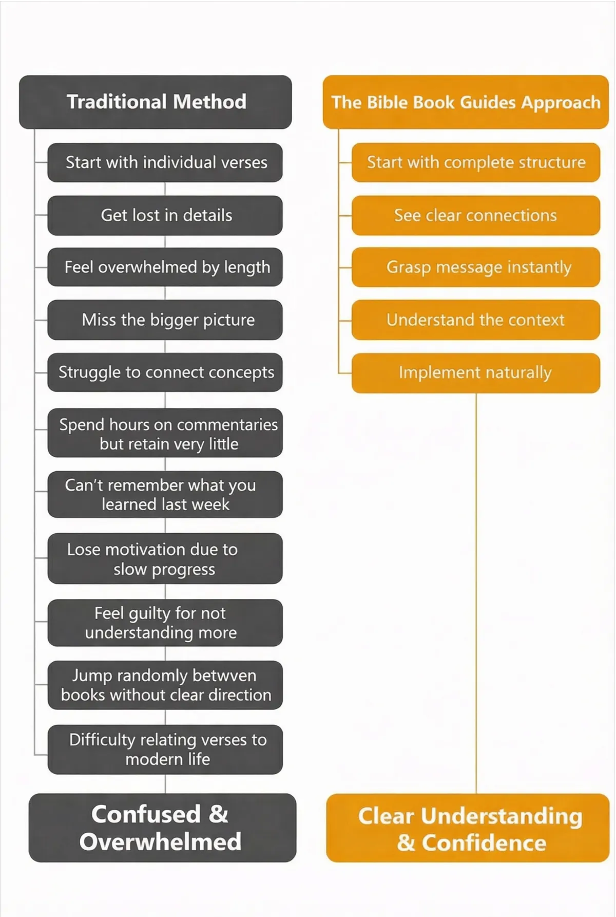 Unlike traditional commentaries that can span multiple volumes or complicated study guides, our Bible Book Guides distill the essential information about each book into a single, easy-to-understand page. They focus on providing context, structure, and key messages rather than verse-by-verse explanation, making them the perfect companion to your regular Bible reading.
